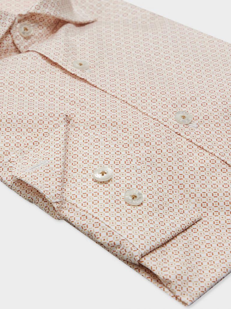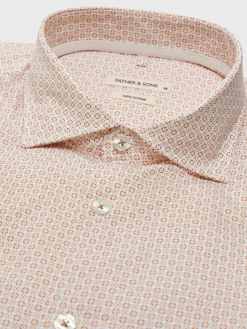 Cette chemise Slim en popeline de coton à motif terracotta offre un look à la fois élégant et dynamique. Sa coupe ajustée épouse parfaitement la silhouette, mettant en valeur un style moderne et raffiné. Le tissu en popeline de coton assure une douceur agréable au toucher et un confort tout au long de la journée. Le motif terracotta ajoute une touche de couleur subtile, idéale pour une tenue à la fois originale et sophistiquée.- Tissage popeline : toile tissée lisse et serrée- Coupe Slim : ajustée et près du corps- Col italien : col ouvert surpiqué aux pointes écartées pour ouvrir le pied de col. Il permet de porter de beaux et gros noeuds de cravates- Liseré en intérieur de col- Gorge simple- Poignets simples à bouts cassés- Empiècement dos- Parement capucin avec bouton